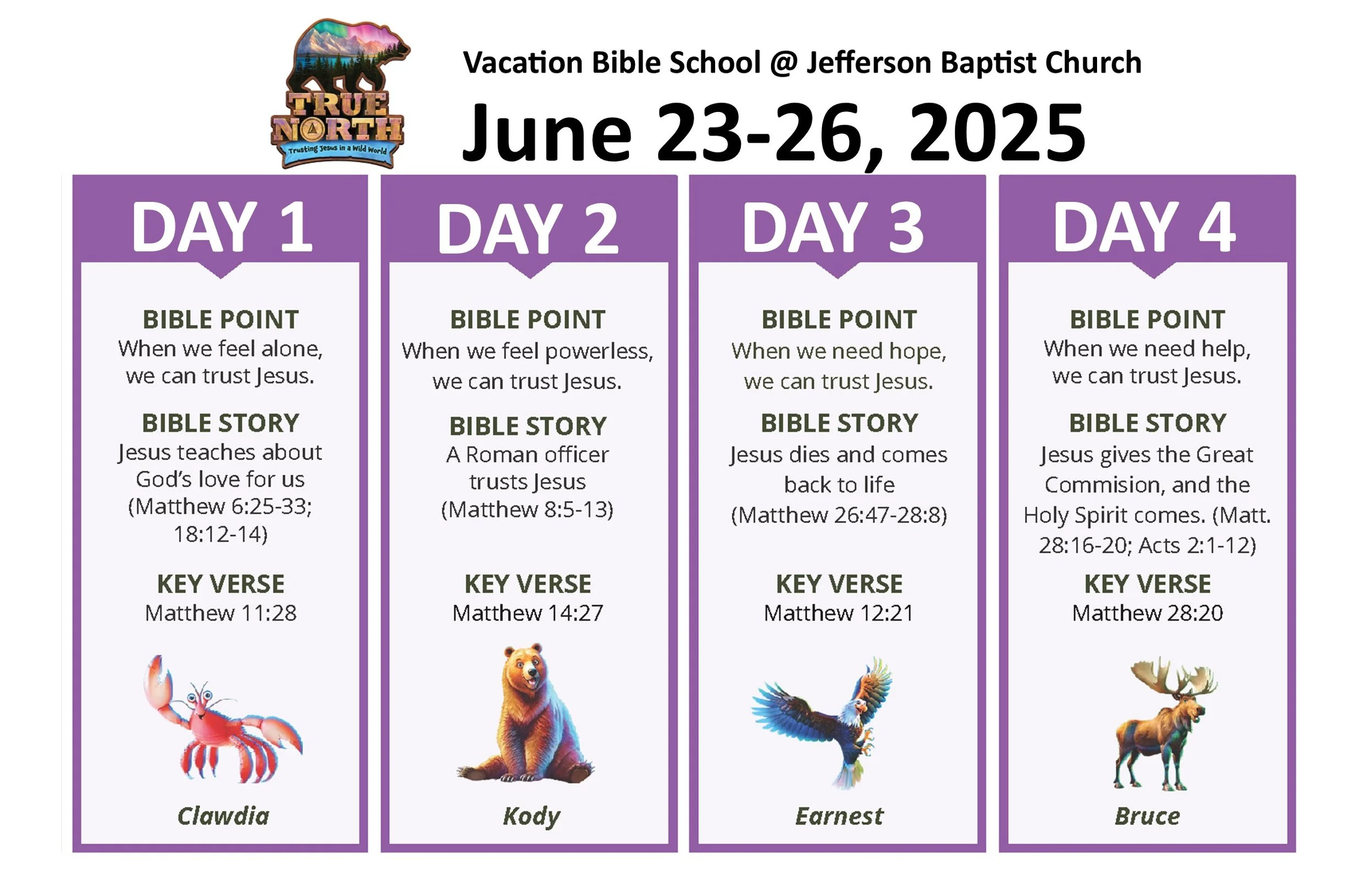 DAILY (Tue-Fri) OFFERING note: coins are heavy for kiddos to carry around (and take many more volunteers to count!) — checks & cash are encouraged! The offering total will be used for a “VBS packing party” for Operation Christmas Child Shoeboxes in mid-october at JBC!